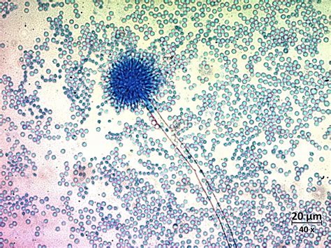 - Morphologie: wie alle Aspergillus produziert er lange, septierte Hyphen, die ein Myzel bilden. Das charakteristischste Merkmal ist sein Konidienträger (die sporentragende Struktur), der mit einer Vesikel endet, von der sich Reihen von Phialiden strahlen, die wiederum Ketten von Konidien (ungeschlechtliche Sporen) produzieren. Diese Sporen sind winzig klein und leicht durch Luft- und Wasserströmungen übertragbar.
